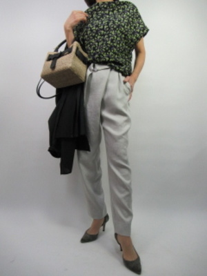 花柄のプリントが上品なブラウス。生地も柔らかくドレープのかかったブラウスを変形ティーパードパンツで合わせてきちんとしたコーデに仕上げました!スタイリッシュ度80%、エレガンス度20%。