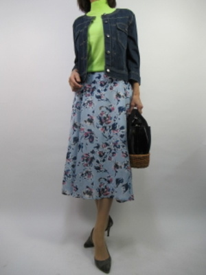 花柄プリントの春を感じるスカートとキレイ色のニットでフェミニンなおしゃれコーデをご紹介。羽織はカジュアルなGじゃんをチョイスして甘口フェミニンを少しカジュアルな装いに変身させてみました!フェミニン度70%、カジュアル度30%。