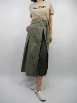 カーキ色のスカートは間に異素材のプリーツを挟んだ女らしい一枚。デイリーにもお洒落に過ごしたいコーデ。フラットな靴で軽さを表現して!アクティブ度100%。