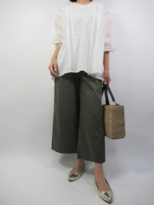 ふんわり甘口ブラウスはカットワークデザインの優しい一枚。ゆったり着れるのでお家の中でも着心地よく過ごせる。パンツはワイドの麻混・・・。手洗いOKの一着です!フェミニン度60%、アクティブ度40%。