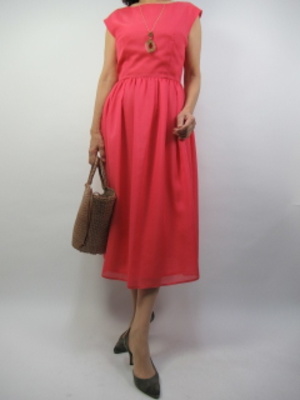 綿素材に見えるポリエステル生地100%で家洗いできる一枚です。きれいなオレンジ系のピンクは夏の強い太陽のように元気が出る色です。これからの季節にぴったりなおしゃれワンピースです!エレガンス度70%、フェミニン度30%。