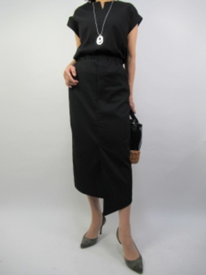 ブラウスとタイトスカートとの組み合わせ。麻混の生地は家洗いできるシリーズです。黒のほかにカーキとブラウンがあり、スカートは7号と9号です。きちんと感のあるセットです!スタイリッシュ度70%、エレガンス度30%。