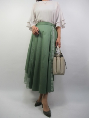 袖ティアードの甘口ブラウスはトロミの生地でしっとりした女っぽさを表現してくれる。Aラインのスカートとの組み合わせでより女子力の強いコーデの出来上がり!フェミニン度70%、エレガンス度30%。
