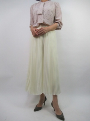 ドット柄風のブラウス。ベージュ色で柔らかい生地にはプリーツパンツがよく似合う。淡いトーンでまとめた秋一番の装い!フェミニン度80%、エレガンス度20%。
