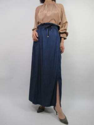 首の詰まり方と袖口のフリル飾り、今年の流行りを入れたブラウスですね。ダンガリーのロングスカートでよりトレンドを意識したコーデに仕上げました!スタイリッシュ度70%、スポーティー度30%。