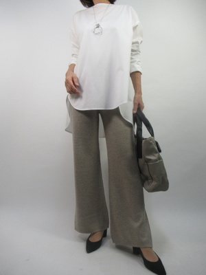 ざっくり大きめのブラウスシャツはテロテロのイージーパンツでメリハリをつけたコーデに。グンと今年らしいラフな中にお洒落なコーデになる!スタイリッシュ度80%、エレガンス度20%。