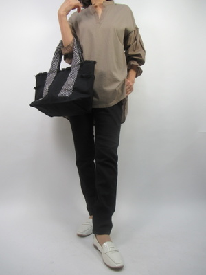 カジュアルなロング丈はブルーデニムをやめて黒デニムにするとコーデすると女らしく大人っぽい着こなしになる!アクティブ度80%、スタイリッシュ度20%。