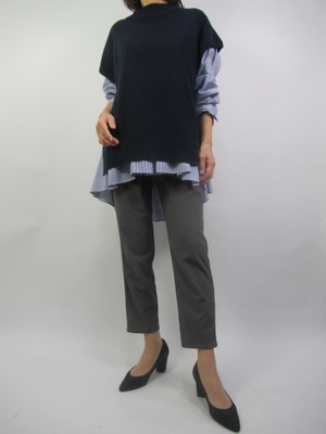 ニットと合わせたレイヤードシャツ。ざっくり大きめなのでボトムスは細めのティーパードパンツを合わせてみました。勿論ニットは外してもOK。着こなしがいろいろ選んで楽しめるレイヤードです!アクティブ度80%、スタイリッシュ度20%。
