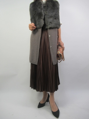 プリーツスカートの女らしい着こなしに。カットソーにファーベストをチョイスして秋を先取りコーデにしてみました!エレガンス度80%、フェミニン度20%。