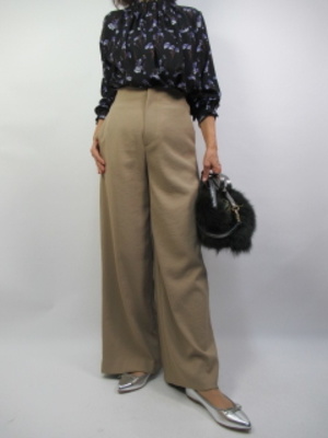 首の詰まったブラウスはウエストインのパンツスタイルでまとめるとすっきりしたコーデになる。花柄でちょっとフェミニンさをプラスしたパンツスタイルのコーディネート!エレガンス度60%、フェミニン度40%。