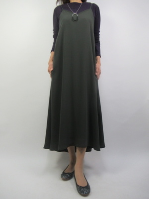 落ち感のある生地のジャンスカは大人っぽい着こなしに最適。カーキ×パープルの配色コーデがさらに大人っぽさを出してくれる!フェミニン度70%、カジュアル度30%。
