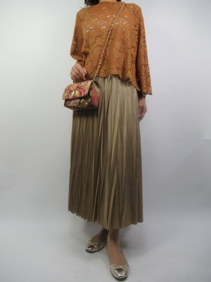 総レースのブラウスはそれだけで上品なエレガンスさを表現してくれる。プリーツスカートの揺れるふんわり感がよりエレガンスな装いになる!エレガンス度70%、フェミニン度30%。