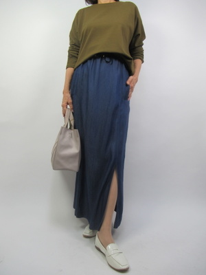 丈長のマキシはデイリーでも取り入れたい一着。カットソーでゆるく着こなすとデイリーも楽しくなる!アクティブ度80%、スタイリッシュ度20%。