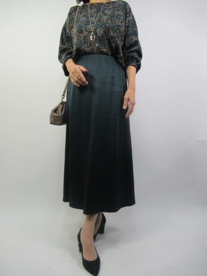 グリーンでグラデーションしたコーデ。小紋柄のブラウスには同色のスカートでまとめた方がよりお洒落に見える。コンサバコーデのフェミニンな着こなし!フェミニン度70%、エレガンス度30%。