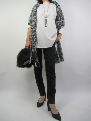 前後差のあるブラウスはすっきりした頃のスキニーデニムで合わせて品のあるコーデに仕上げてみました。ストールを肩から垂らしてIラインを作るとおしゃれ度もアップする!スタイリッシュ度80%、エレガンス度20%。