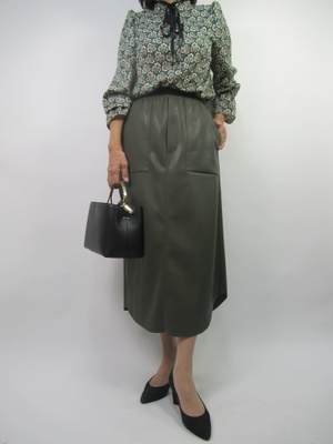 モスグリーンのあいまいカラーの今年の色ですね。合皮のスカートの辛口スタイルをブラウスの小紋柄で甘さをプラスした大人のフェミニンコーデ!フェミニン度60%、スタイリッシュ度40%。