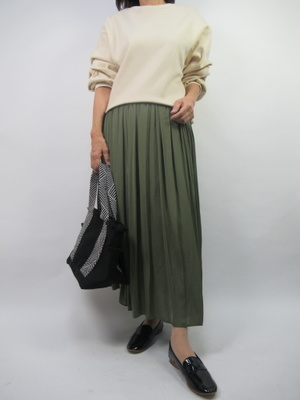 袖口にポイントを効かせたトレーナーをギャザースカートで女らしくコーデ。足元はローハーで軽やかにしてデイリーコーデの完成!アクティブ度70%、フェミニン度30%。