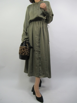 とても長さのあるシャツワンピースはウエストで絞ることでメリハリをつけてバランスの取れたシルエットになる。カーキ色のアースカラーは秋を感じる色ですね!スタイリッシュ度60%、フェミニン度40%。