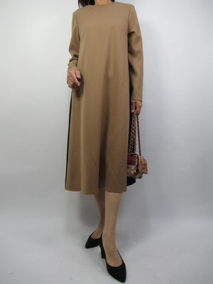 一枚で絵になるオシャレワンピース。脇の配色がスマートに細身に見えるようなデザイン。やや丈長ですがキレイ目の一枚はちょっとお出かけシーンにもピッタリな秋から冬のワンピーススタイル!エレガンス度70%、フェミニン度30%。