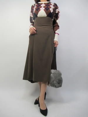 ハイウエストでミモレ丈のスカートはフェミニンな装いにぴったり。ニットは少し外してカジュアルなアーガイル柄で気負わないコーデ!フェミニン度70%、カジュアル度30%。