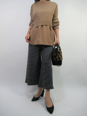 レイヤード仕立てのデザイン。ニットは一枚で絵になる完成度の高い一着。ツイードのガウチョパンツ合わせて着映えコーデ!スタイリッシュ度60%、エレガンス度40%。