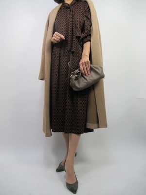 ボウタイのシックな柄ワンピース。とてもコンサバなデザインなのでちょっとした会食にもピッタリあう。寒くなったので同系色の薄手のコートを合わせればエレガントなお出かけコーデ!エレガンス度70%、フェミニン度30%。