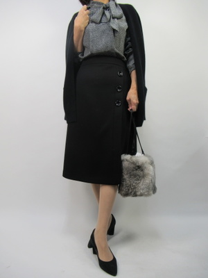 黒をベースにしたコーディネートですがボウタイブラウスと台形スカートでフェミニンなデザインなので黒でも上品な大人可愛いファッションになる。やっぱりスカートというスカート派の方にぴったりなコーデ!フェミニン度70%、エレガンス度30%。