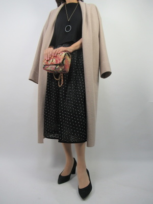 スカート部分は二枚重ねのオーガンジー素材で、とても上品な一着。身頃は黒のカットソーで伸縮があるので動きやすく着やすいワンピースです。これからの年末天使に一枚あると重宝するワンピース!エレガンス度80%、フェミニン度20%。