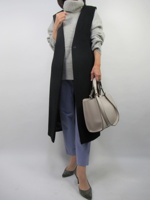 丈長の黒のお洒落ジレをスタイリッシュに着こなす。キレイ色のパンツに合わせてみる。冬に向けて明るい色をチョイスするだけで見た目も気分も元気になるおしゃれコーデ!スタイリッシュ度80%、エレガンス度20%。