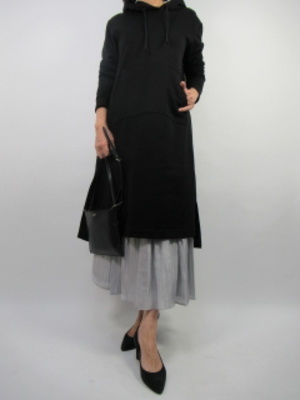カジュアルなパーカワンピースはギャザースカートをプラスするだけでキレイ目コーデに変身できる。モノトーンの色の組み合わせで大人のオシャレの完成!フェミニン度60%、スタイリッシュ度40%。