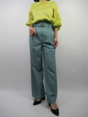 鮮やかな黄色のブラウスにブルーのパンツでとても華やかなコーディネート。ワイドパンツはウエストマークでスッキリしたシルエットがポイントです!スタイリッシュ度80%、エレガンス度20%。