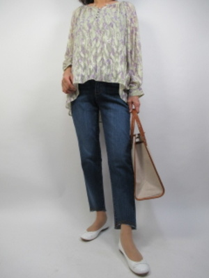 ふんわり甘めのブラウスにデニムをプラスした甘辛ファッションはデイリーを少しきれい目にしたご近所スタイル!フェミニン度60%、カジュアル度40%。
