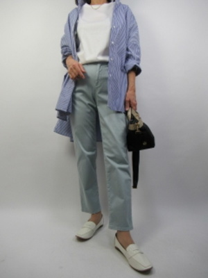 オーバーサイズのシャツも羽織るようにコーディネートしてラフな休日ファッションに華を添える着こなし。同色のカジュアルパンツで爽やかな組み合わせに。足元の白で抜け感を出したコーデ!カジュアル度100%。