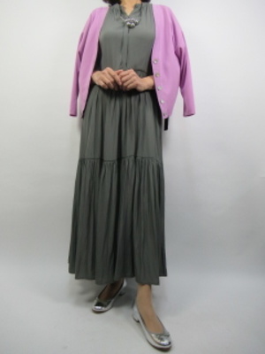一枚で絵になるワンピースは、これからの時期とても重宝しますね。ダークなカラーですがティアードの甘さのあるデザインが若々しい。カーキに合うピンクを肩にかけて顔周りを華やかに見せる着こなし!フェミニン度70%、エレガンス度30%。