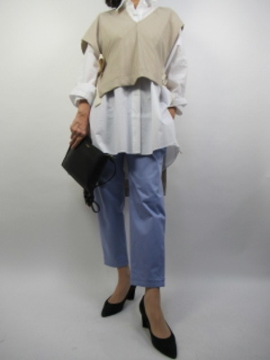 レイヤードファッションは今年流行。前後差の長さが特徴のベストを重ね着してオシャレなレイヤード仕上げにしました!スタイリッシュ度60%、カジュアル度40%。