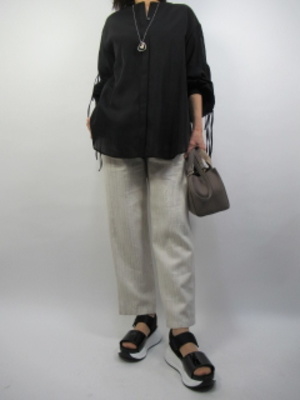白×黒のハッキリした色コーデをブラウスの甘さでカバーする。袖のヌケ感がこのコーデのポイント。遊びを取り入れた大人カジュアルコーデ!カジュアル度100%。