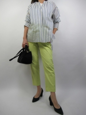 シャツコーデが今年は支流ですね。とてもきれいな色は特に春にふさわしい一着。ストライプのシャツのブルーと黄色のパンツはオシャレな春コーデ!スタイリッシュ度60%、カジュアル度40%。