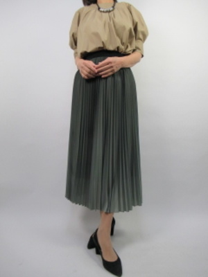 裾に向かってグラデーションの色がおしゃしゃれなスカートに。バルーン袖のブラウスでフェミニンスタイルに。ウエストマークすることでバルーン袖のボリュームが抑えられてスッキリしたコーデになる!フェミニン度60%、エレガンス度40%。