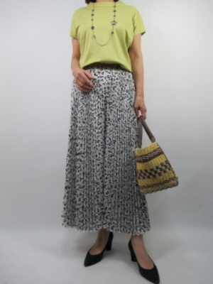 白地にプリント柄のおなじみプリーツパンツ。トップスに黄色系のカットソーを合わせて爽やかな春から夏のお出かけコーデ!フェミニン度60%、エレガンス度40%。