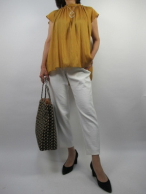 白はとても合わせやすくコーデに迷ったときは白を持ってくれば一瞬で素敵なコーデの完成になる。のスリーブの柔らかいブラウスできれいめコーデして夏のお出かけにスタイルに!スタイリッシュ度70%、カジュアル度30%。