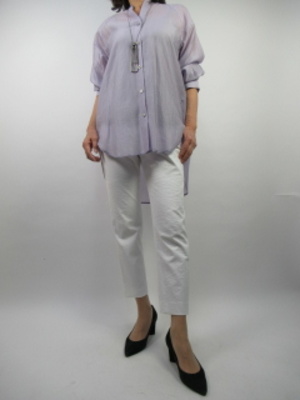 大人のパープル色はなるべく顔映りのいいツヤ感のあるいろがオススメ。そして必ず白を合わせて爽やかさを表現。ふんわりシルエットにテーパードで引き締めたバランスの良いコーデ!スタイリッシュ度70%、カジュアル度30%。