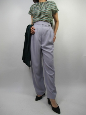幾何学模様のブラウスは夏素材で今丁度着れる秋の新作デザイン。グリーン系とパープルの色がとってもしっくり秋を表現してくれる。オシャレコーデ!スタイリッシュ度60%、エレガンス度40%。