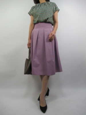 コンサバなコーデをお好みの方にAラインスカートはお勧めのアイテムです。幾何学模様のブラウスと合わせればとても上品なコーデになります!エレガンス度60%、フェミニン度40%。