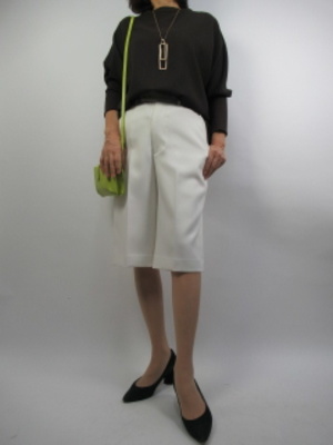 キレイめのハーフパンツがこの秋登場します。大人でもオシャレに着こなせるパンツは丈長のブラウスでサラッと合わせて白×ブラウンはより大人っぽさを強調したコーデ!スタイリッシュ度60%、エレガンス度40%。