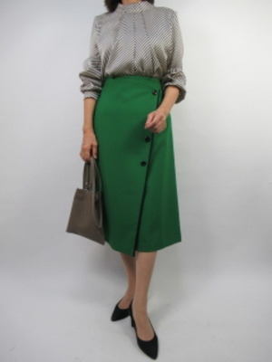 ベーシックなエレガントを作るならブラウス+台形スカートが品よくまとまる。変形ストラップの黒とグリーン色がマッチしてベーシックな中にも華のあるコーデ!エレガンス度60%、フェミニン度40%。