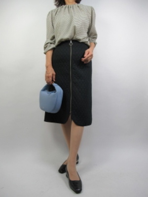 キルティング素材が注目されてきました。前ファスナーのスカートはボリュームが出ないようタイトシルエットにデザインしています。甘さのあるブラウスでコーデしました!フェミニン度60%、アクティブ度40%。