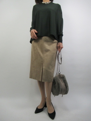 体のラインをふんわり隠してくれるスクエア型のニットはボトムスを細くタイトにするとバランスがとれてスッキリ感の出るコーデになる!フェミニン度70%、エレガンス度30%。