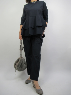 ナイロン素材のサラッとした質感と適度なお落ち感の生地で作るキレイめパンツのセットアップです。ブラウスのペプラムでエレガントさを強調!エレガンスド70%、スタイリッシュド30%。