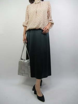 ブルーグリーンの色と生地のツヤ感が合わさってとてもオシャレなスカートはフェミニンで上品なブラウスがよくマッチする。ちょっとおでかけにピッタリのコーディネート!エレガンス度60%、フェミニン度40%。