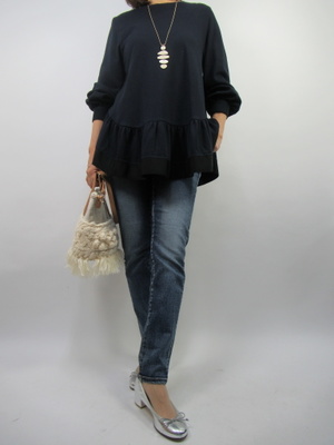 一見甘く見られるペプラムデザインのカットソーはラウンドしたシルエットなので大人っぽく着こなしてもらえます。細物デニムでスッキリとコーデしてみました!アクティブ度100%。